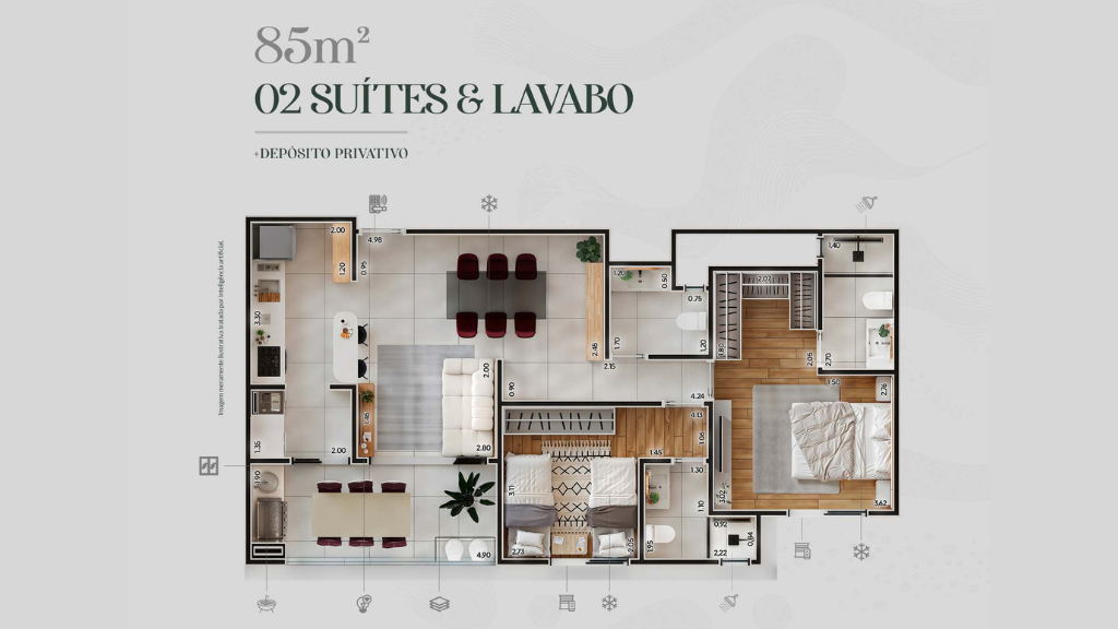 Apartamentos de 85m²: 02 suítes + Lavabo
