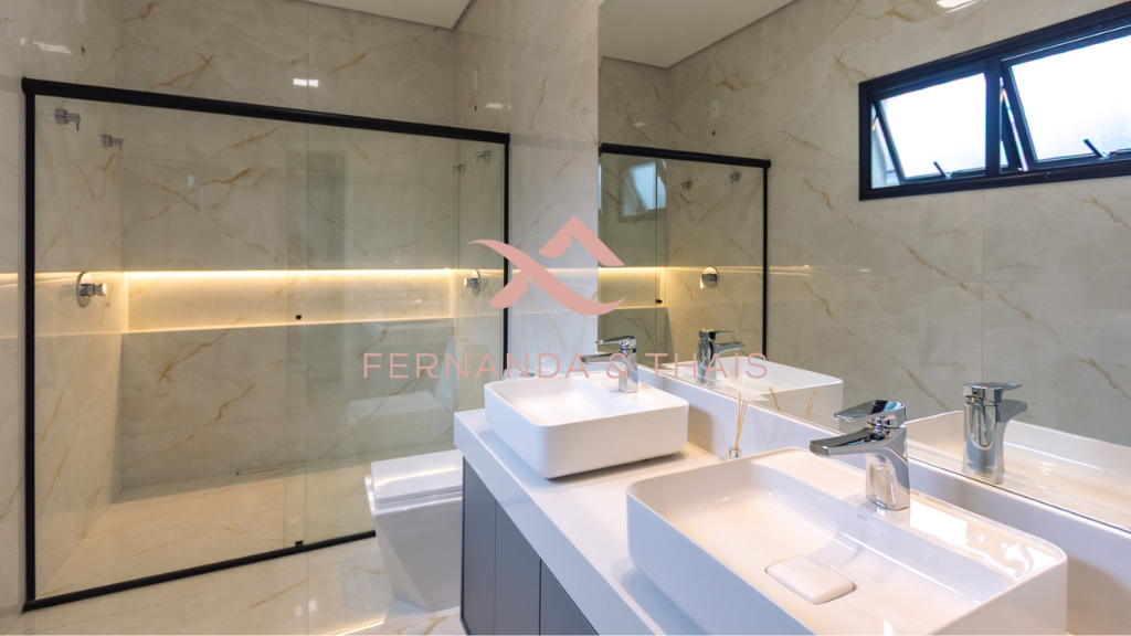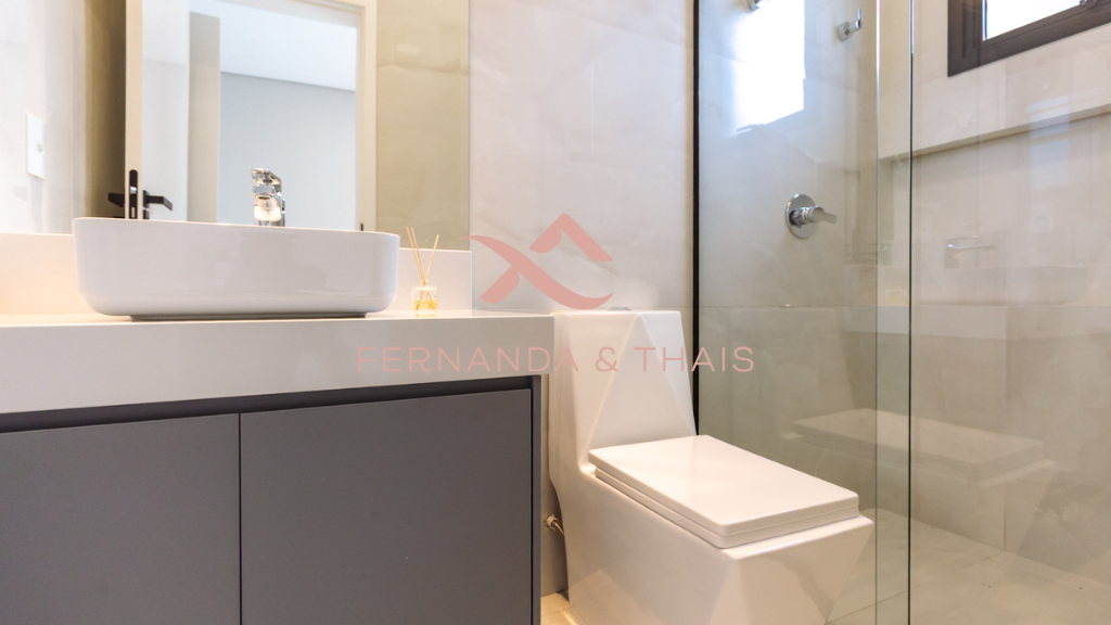 ✔️ Banheiros com bancadas em branco prime, móveis planejados e box