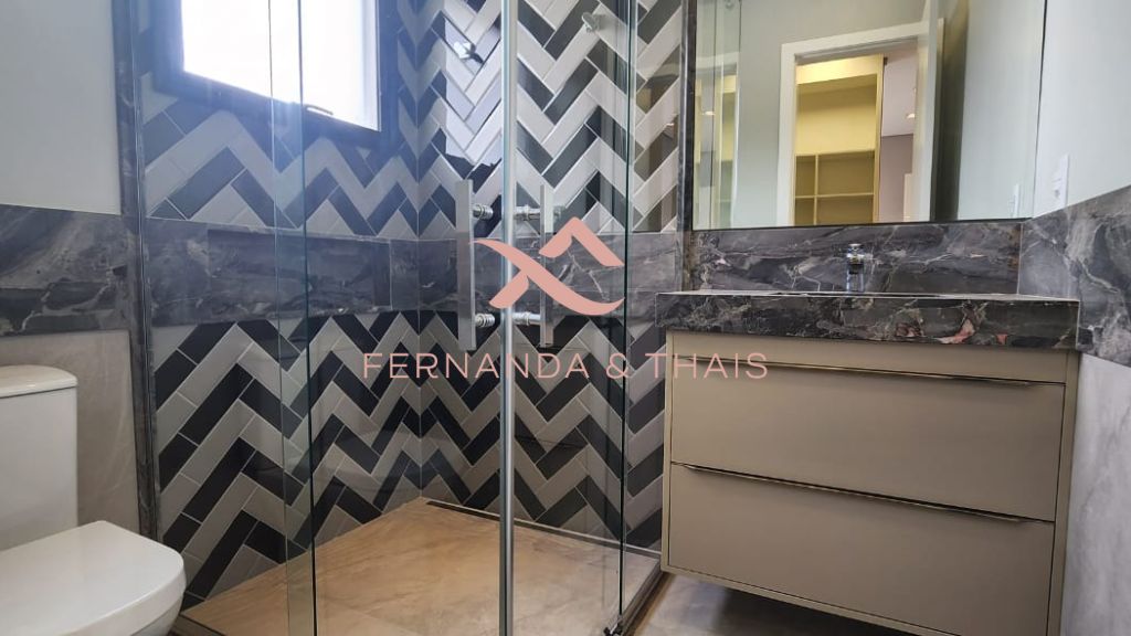 ✔️ Banheiro master com pia dupla, banheira de hidromassagem dupla com teto de vidro, área de banho grande com 2 chuveiros de teto e sanitário reservado