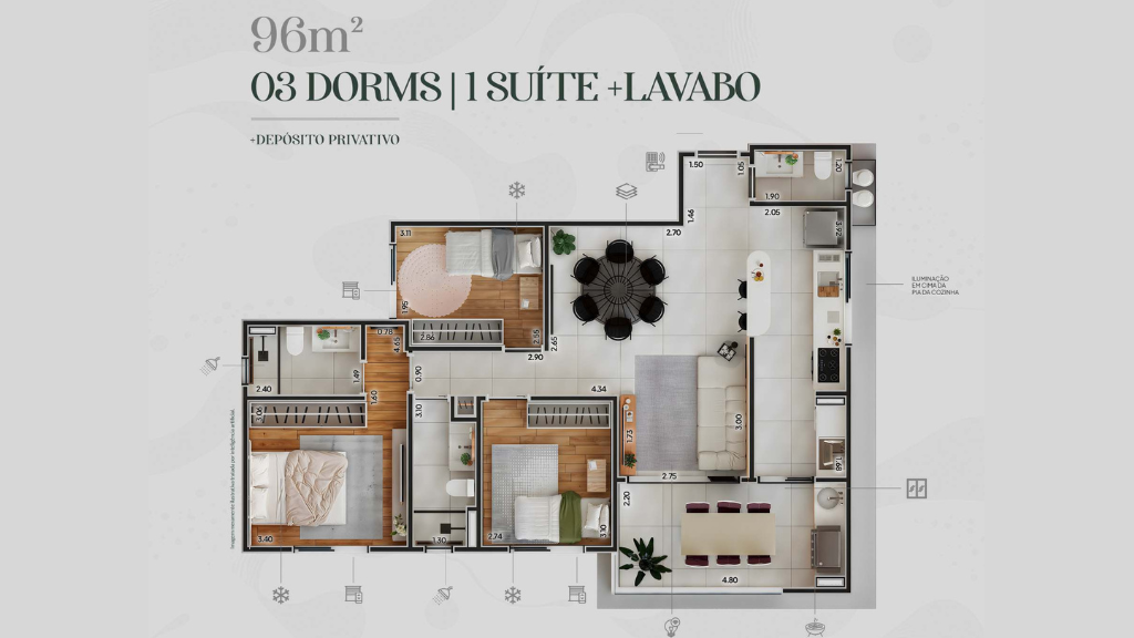 Apartamentos de 96m². 03 dormitórios, sendo 01 suíte + lavabo