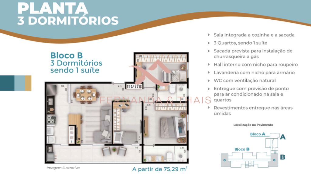 ✔️ 03 Dormitórios ( 01 suíte), total 75,29 m²,